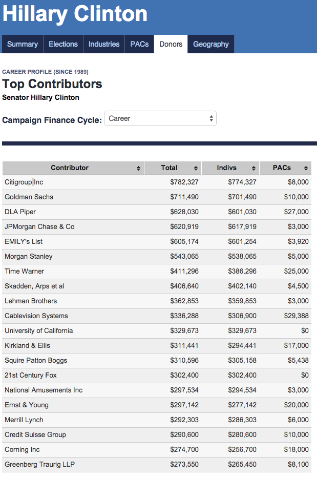 - Finally, Ms. Clinton has made some recent headlines, hammering Wall Street and being quoted calling for a toppling of the 1%. Okay. This sounds pretty pro-middle and working class. But to what extent do we believe her? I’m reminded of this, which hopefully is self-explanatory:
