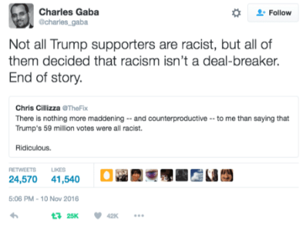 How racist is the right? Well, as that meme says, you didn’t have to be racist to vote for Trump, but racism wasn’t a deal-breaker for you. As my co-editor Brian Angliss wrote here a few months back in a brutally insightful piece: